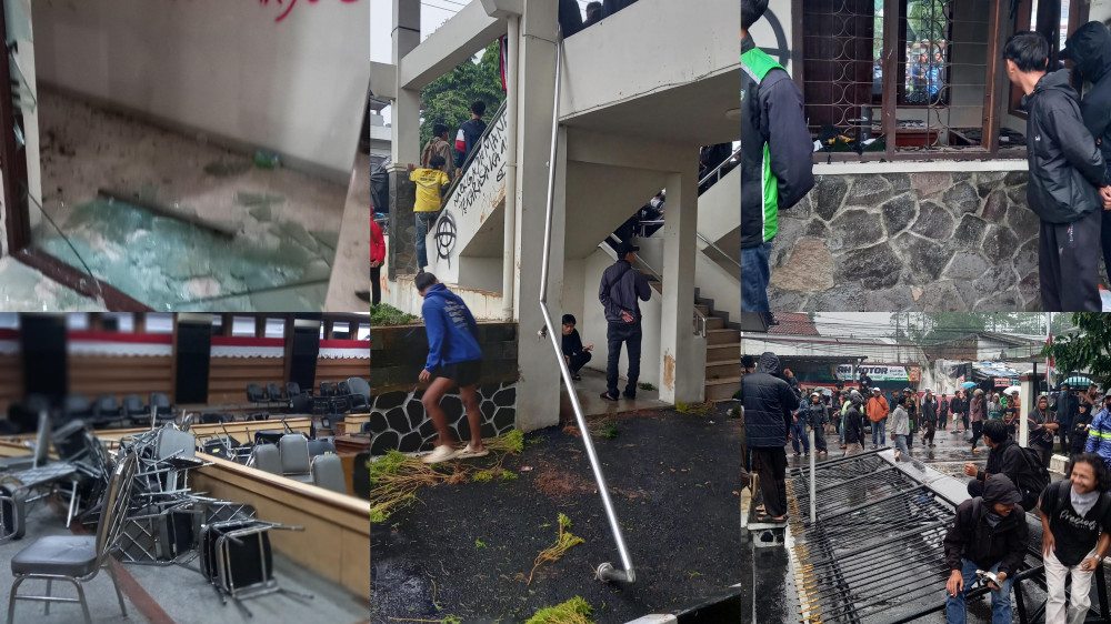 Massa merobohkan gerbang masuk dan keluar Gedung DPRD, merusak pos satpam, pintu lobi, pot bunga, kaca, hingga kursi dan meja ruang Paripurna.