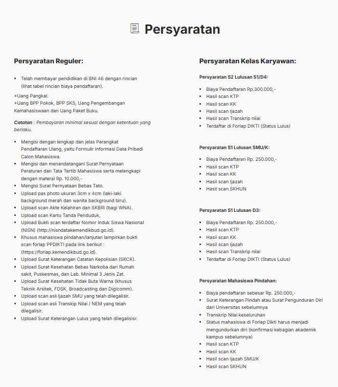 Berikut ini meliputi persyaratan reguler, persyaratan kelas karyawan dan persyaratan mahasiswa pindahan.
